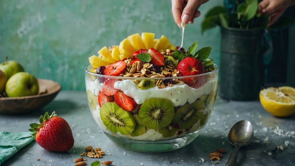 Tak hanya sebagai pelengkap rasa, yoghurt adalah bahan ajaib yang membuat salad buah menjadi lebih bergizi. Teksturnya yang lembut dan rasa asam segar membuatnya pas dengan buah-buahan.